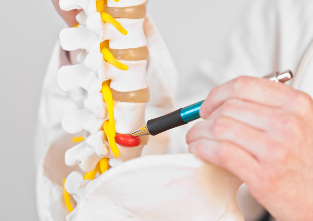 「椎間板ヘルニアって、結局何が起きてるの?」とよく聞かれるのですが、簡単に言うと、背骨の間にあるクッションのような椎間板が飛び出して、すぐそばを通っている神経に触れてしまっている状態のことです。この飛び出た部分が神経を押してしまうことで、痛みやしびれが出るんですね。