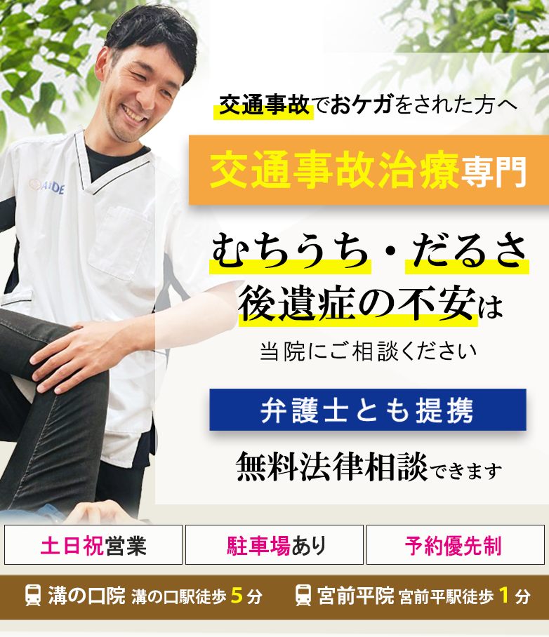 治療費の窓口負担が0円自賠責保険という国の制度を適用して、交通事故施術を受けることができます。窓口負担は0円で通院いただくことができます。(※事故の状況によって一部例外はあります)